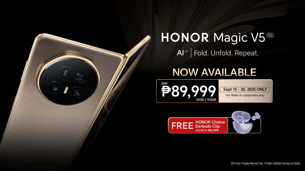 Available in three stunning colorways Ivory White, Dawn Gold, and Reddish Brown, you can now get HONOR Magic V5 for only Php 89,999 at any HONOR Partner and Experience Stores or online via Lazada (https://bit.ly/Laz_V5_PR), Shopee (https://bit.ly/Shop_V5_PR), and TikTok Shop (https://bit.ly/TikTok_V5_PR) with FREE HONOR Choice Earbuds Clip worth Php 4,999 until September 30, 2025!